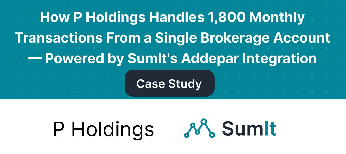 Solution: P Holdings implemented SumIt, consolidating its accounting into a single investment-aware general ledger with native Addepar integration and real-time cash connectivity.