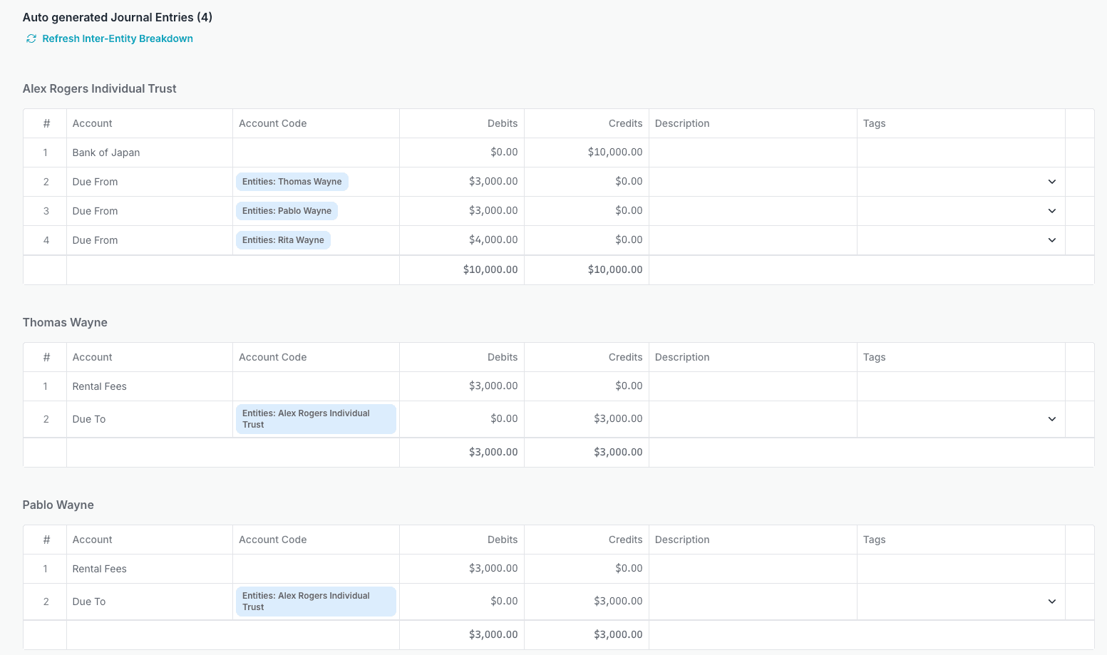 In SumIt, you can select those transactions, and the system will automatically generate the corresponding journal entry pairs across entities, recording both the expense and the due-to / due-from relationship.