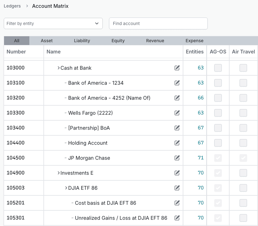 One chart of accounts across every entity.