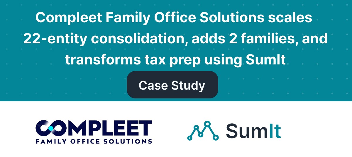 Compleet Family Office Solutions scaled a 22-entity structure, eliminated Excel consolidations, and accelerated tax planning using SumIt’s purpose-built family office accounting software.